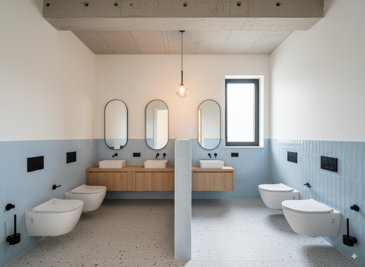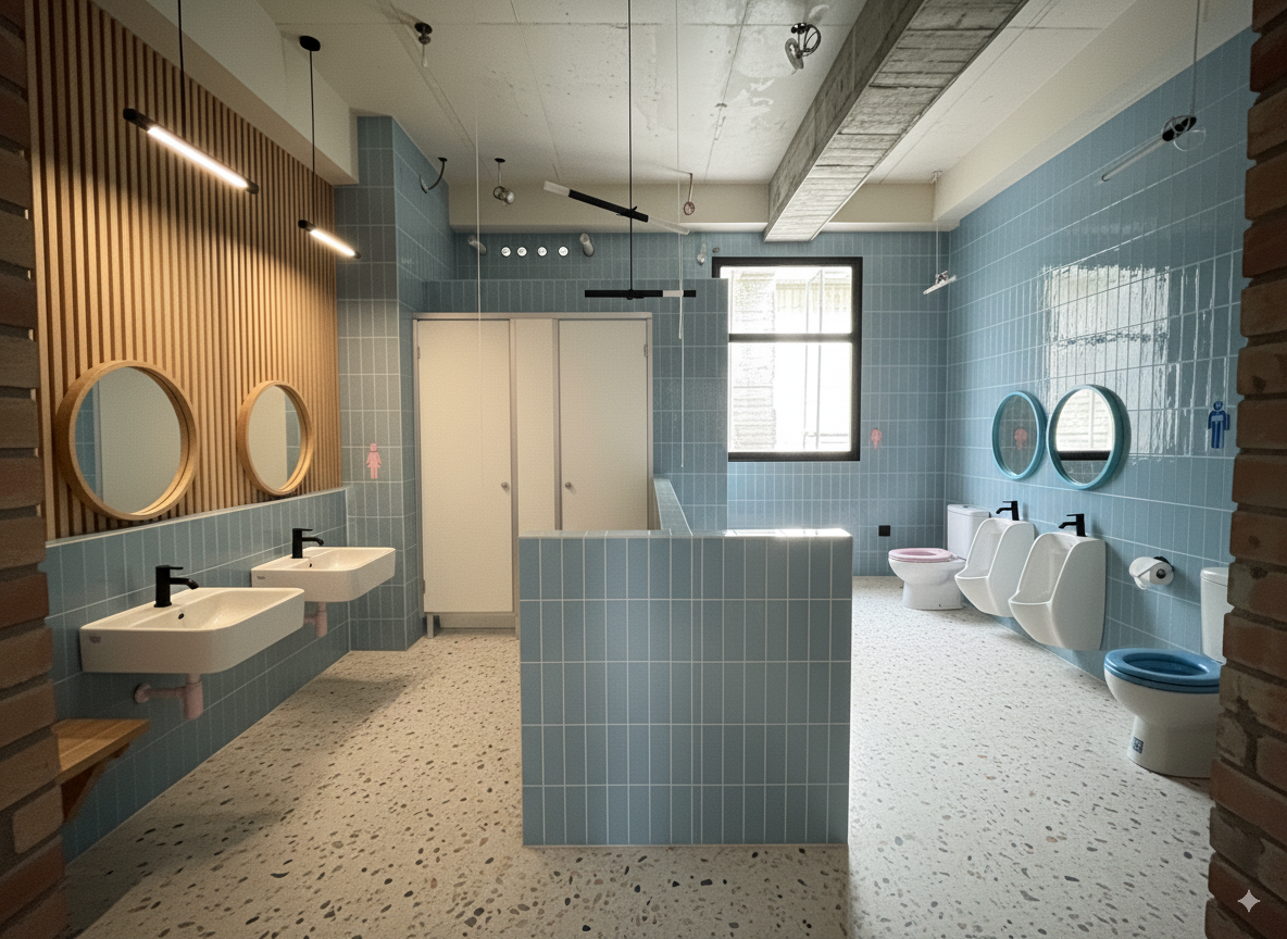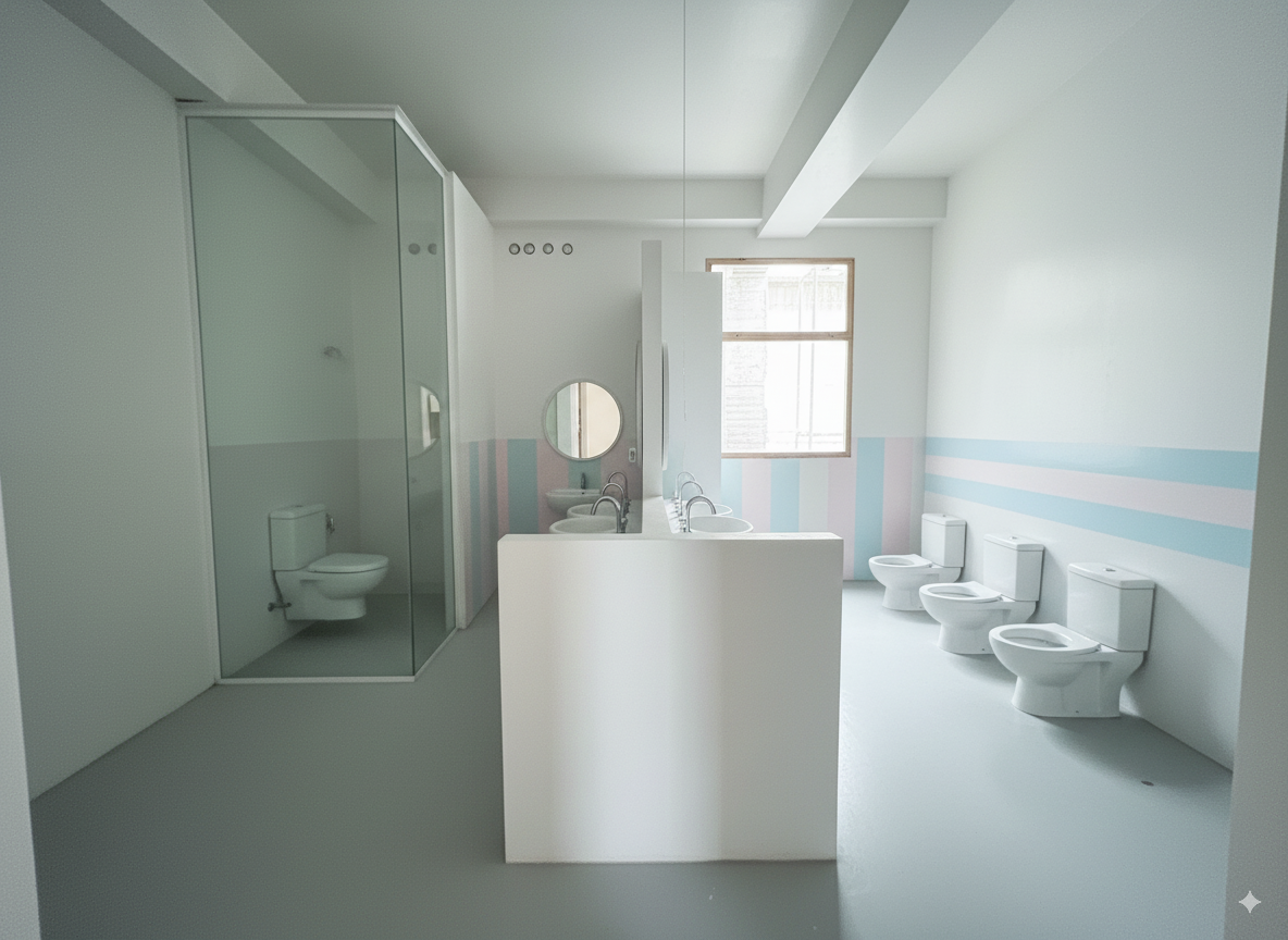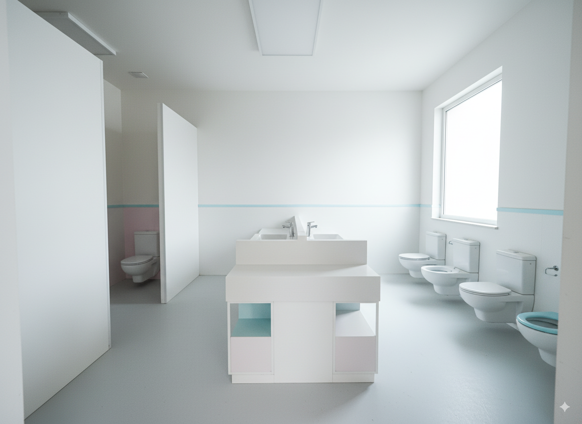 This rendering needs to be corrected, as the intended function of the space was misunderstood. This is actually a kindergarten restroom designed specifically for young children. The right side should be designated as the boys’ restroom, and the left side as the girls’ restroom. In the center, the low partition wall should have sinks on both sides for the children to wash their hands. Additionally, the opening at the back right is meant to be a window, not a door. Please update the design accordingly.