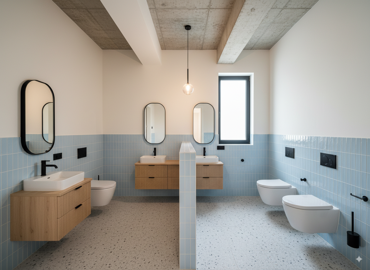 | Convert the overall interior decoration style of this current powder-blue restroom rendering to match the materials and style shown in this poster. | ![]() |