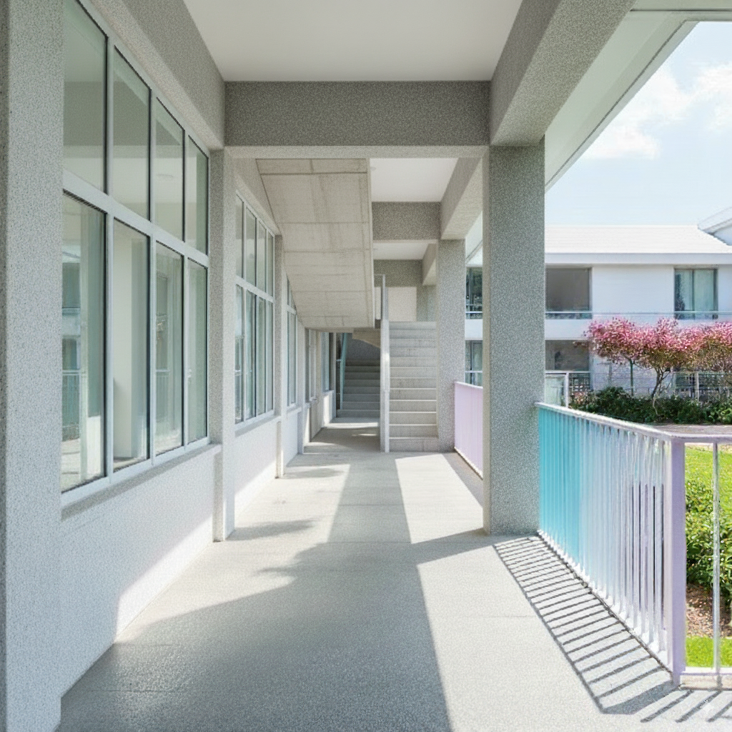 “Minimalist contemporary architecture style, emphasizing clean geometric lines and uncluttered surfaces. Bright white facades that reflect natural light, smooth matte finishes, and a sense of crisp purity. Accents in pastel tones, such as soft blue and pink, add a subtle playful contrast to the otherwise neutral palette. Large glass elements evoke openness and transparency, while the overall atmosphere feels airy, calm, and serene. The style conveys modern simplicity, refined elegance, and a fresh, tranquil ambiance”