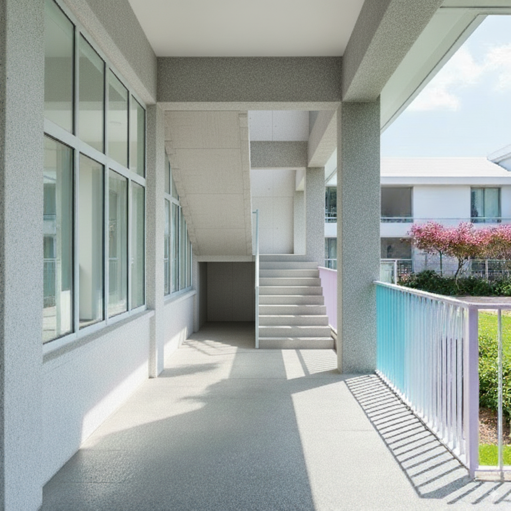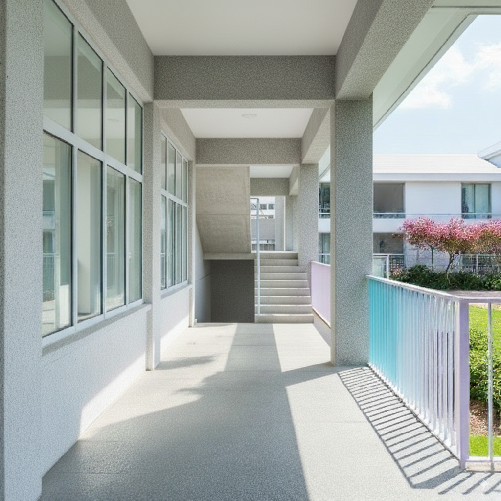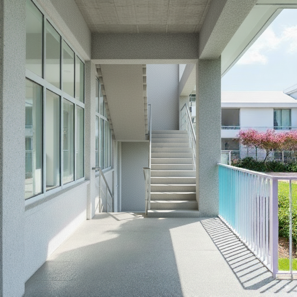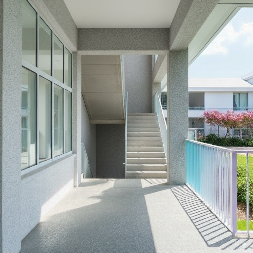 * **Appearance:** It features a light grey or white cementitious base with a dense pattern of small, multi-colored aggregate (stone chips). The specks appear to be in various neutral shades of grey, black, and possibly beige, creating a subtle, textured pattern that is both durable and visually interesting.